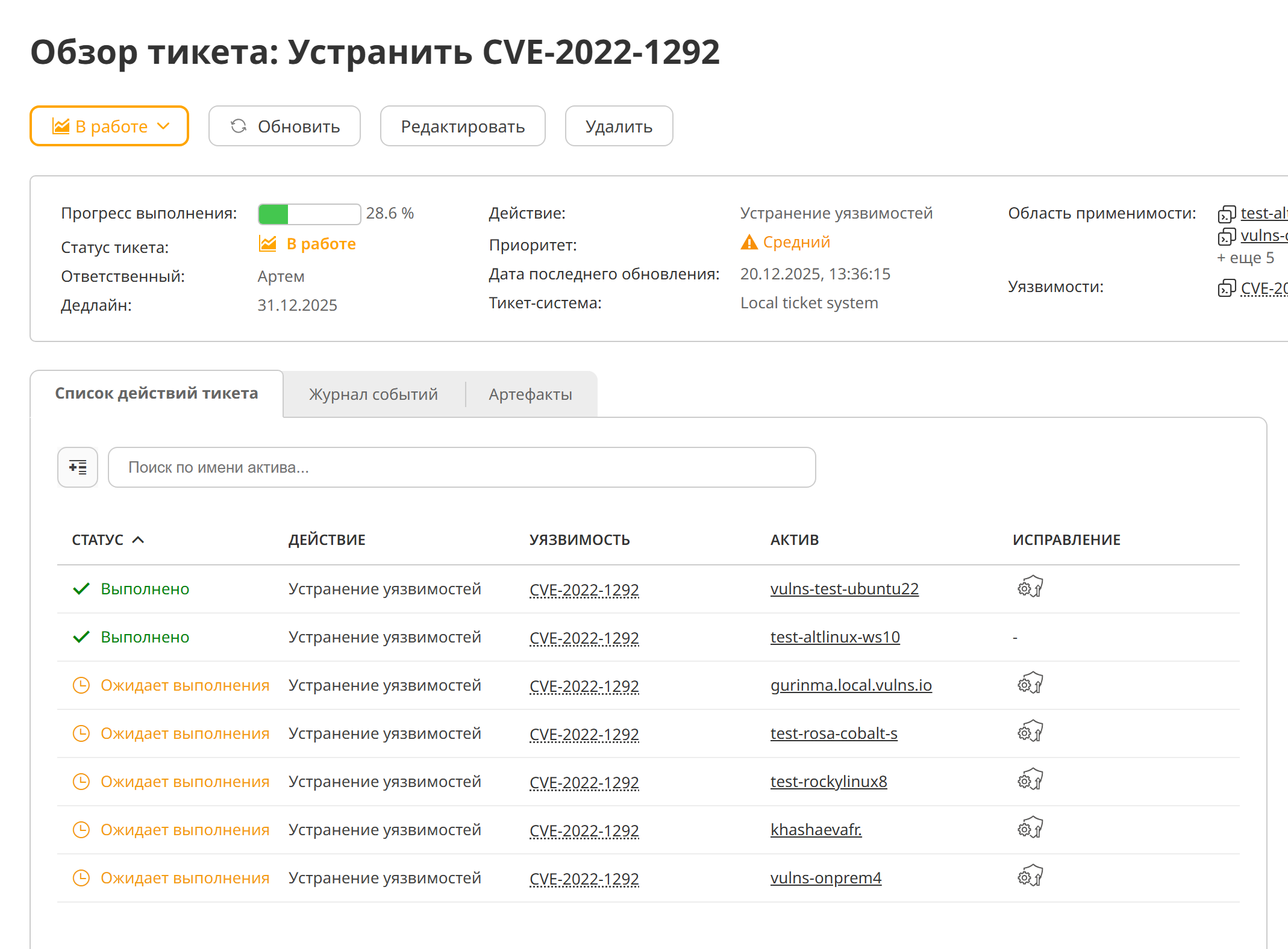 Обновление уязвимого ПО в режиме «единого окна» - прямо из результатов аудита, рекомендации по компенсирующим мерам, добавление уязвимостей в списки исключений, создание заявок на устранение уязвимостей